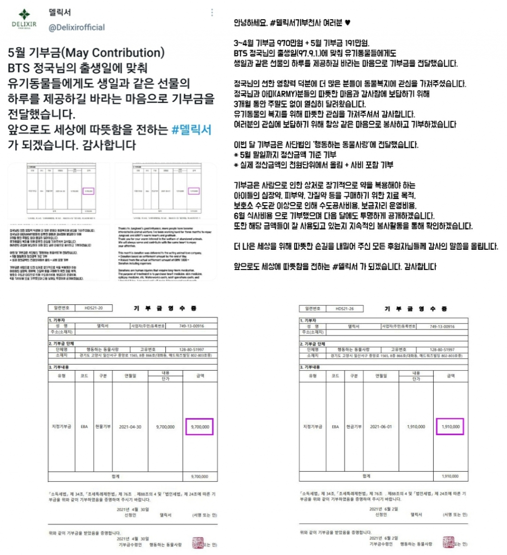 델릭서에 따르면 정국과 아미들의 따뜻한 마음과 감사함에 보답하기 위해 3개월 동안 주말도 없이 열심히 달렸고, 사단법인 '행동하는 동물 사랑'에 3월~4월 기부금 970만원과 5월 기부금 191만원이 전달됐다. 델릭서는 "기부금은 아픈 동물들의 치료와 식사 등에 쓰일 예정"이라고 전했다.