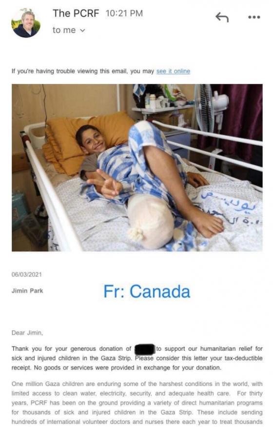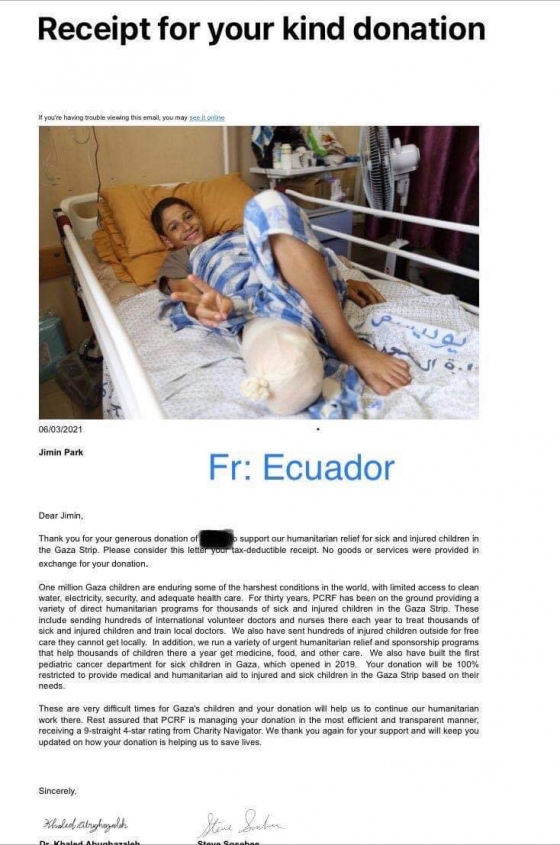 지민의 필리핀 팬베이스 PJMAngelsPh & INT'L 은 두번째 기부에 나섰다. PJMAngelsPh & INT'L 은 지난 4일 '지민의 데뷔 8주년을 맞아 '팔레스타인 어린이 구호기금'(Palestine Children's Relief Fund, PCRF)에 지민의 이름으로 기부했다'고 밝혔다.