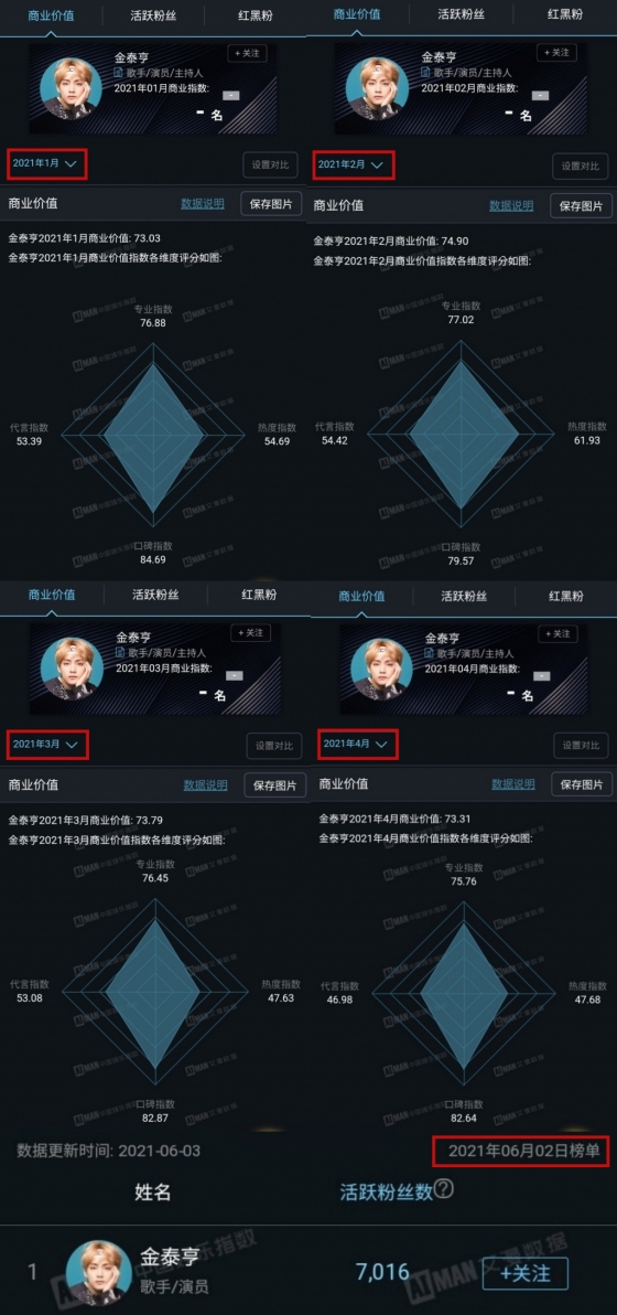 뷔는 2021년 1월부터 4월까지 중국 '아이만상업가치지수'(Aiman Commercial Value Index) 총결산 결과 방탄소년단 멤버 중 가장 높은 점수를 기록했다.