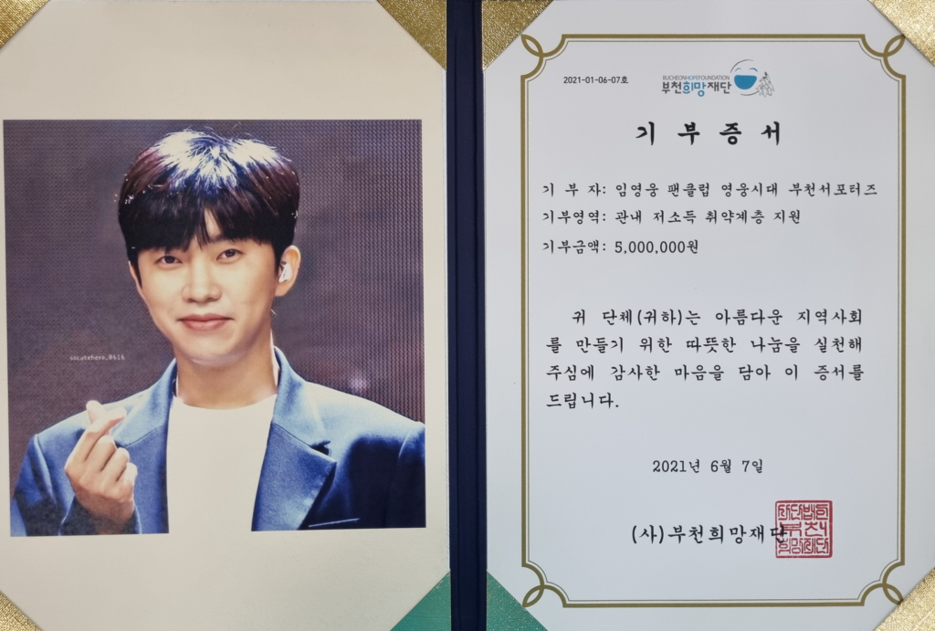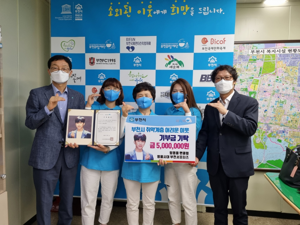 임영웅 팬클럽 영웅시대 부천서포터즈는 지난 7일 경기도 부천시 원미구 중동로 사단법인 부천희망재단을 찾아 관내 저소득 취약계층 지원을 위한 기부금 500만 원을 전달했다.