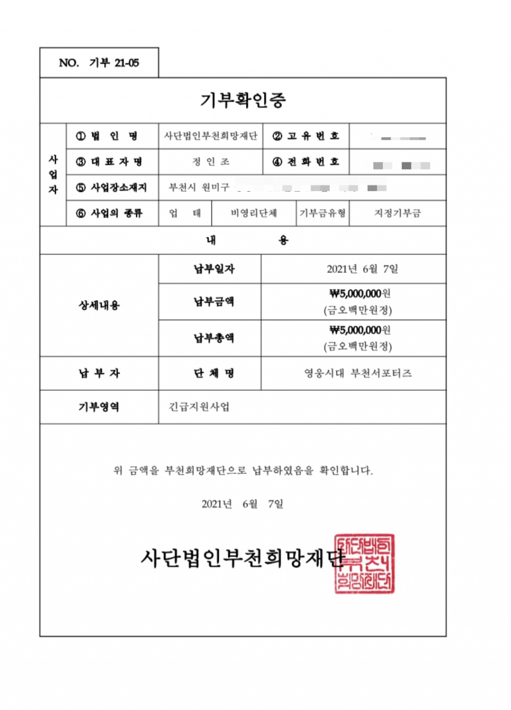 부천서포터즈는 "부천희망재단이 취약계층과 어려운 이웃들에게 등불과도 같은 도움의 손길을 주고 있다는 것을 알게 돼 기부하기로 결정하게 됐다"라고 밝혔다.