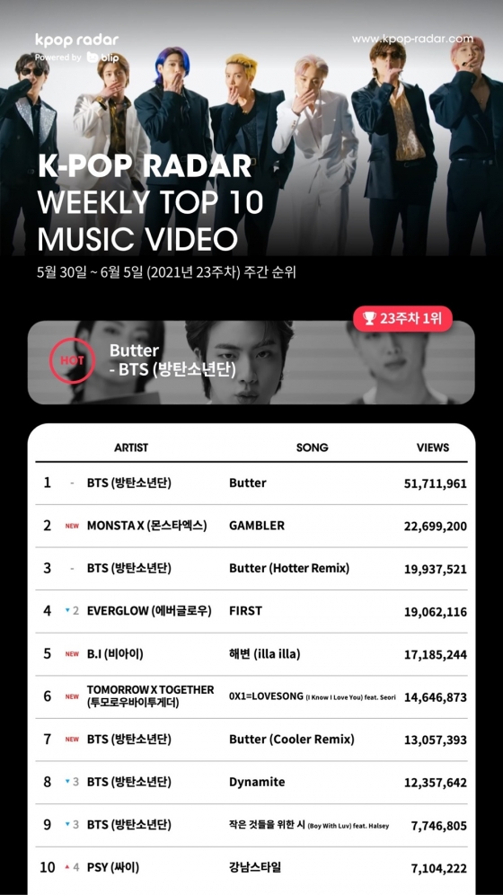 지난 5월 21일 발매된 방탄소년단의 신곡 'Butter'는 6월 1주(5월 31일~6월 6일) 차에도 정상에 서며 뜨거운 인기를 증명했다. 'Butter'는 마음을 흔드는 방탄소년단의 귀여운 고백이 담긴 청량한 댄스 팝 장르의 서머송으로 뮤직비디오 조회수 3억 뷰를 돌파하는 등 해외에서도 높은 인기를 누리고 있다.