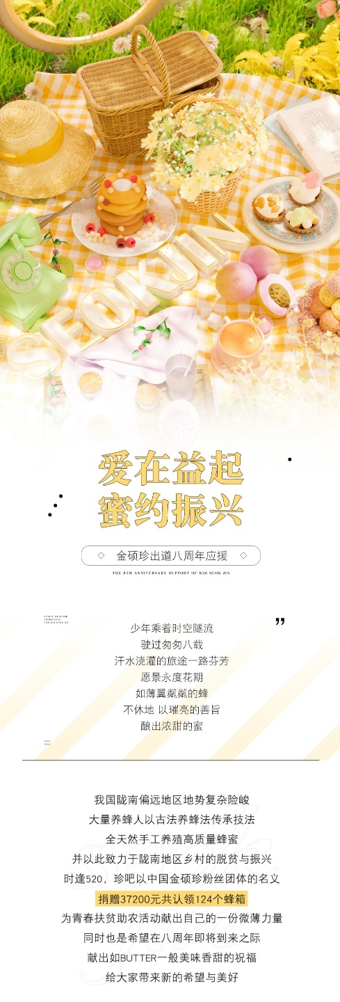 진의 중국 팬베이스 '차이나 진 바'는 빈곤 퇴치를 위해 '김석진과 중국팬 차이나 진바'의 이름으로 중국 간쑤성 Longnan 지역 시골마을에 3만 7200위안(한화 약 650만원)을 기부, 124개의 벌집을 분양 받을 수 있게 도움을 줬다. 이 프로젝트는 진의 데뷔 8주년을 축하하기 위한 차이나 진바의 서포트 활동 중 일부이다.