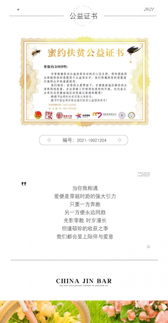 중국 자선단체 'Power China'는 'Miyue(밀약, 벌꿀약속) 빈곤 퇴치 기부 증서' 이름으로 기부증서를 발급했다. 증서에는 "빈곤 퇴치 활동에 대한 귀하의 관심과 지지에 무한한 감사를 드립니다. 귀하의 사랑과 도움으로 간쑤성 Longnan 지역의 양봉업자들의 삶이 개선될 것이며, 그들의 전통적 양봉 방식이 더 잘 지켜질 것입니다. 단체와 원조 받는 지역을 대표하여, 귀하에게 진심어린 감사를 전하고 싶습니다. 김석진님을 '빈곤 퇴치 대사'로 특별 임명합니다. China Jin Bar를 'Miyue 빈곤 퇴치 자선 단체'로 임명합니다"라고 담겼다.