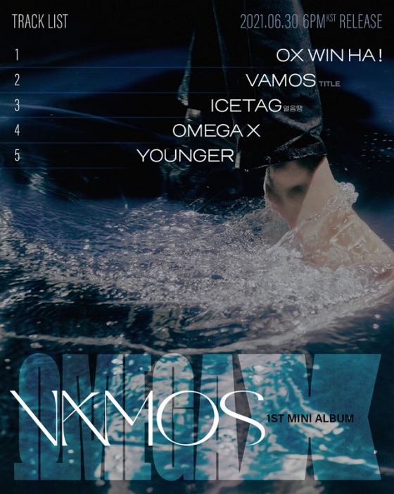 공개된 이미지에는 앨범명과 동명의 타이틀곡 'VAMOS'를 비롯한 'OX WIN HA! (오엑스 윈 하!)' 'ICETAG (얼음땡)' 'OMEGA X (오메가엑스)' 'YOUNGER (영거)' 등 총 다섯 트랙의 곡명이 담겨 있다.