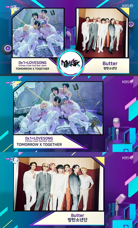 11일 오후 방송된 KBS 2TV '뮤직뱅크'에서는 방탄소년단의 'Butter'(버터)와 투모로우바이투게더의 '0X1=LOVESONG (I Know I Love You)'(제로바이원러브송)이 1위 후보에 올랐다.