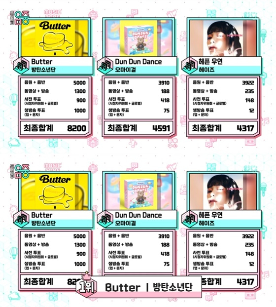 이날 공개된 1위 후보에는 세 팀이 이름을 올렸다. 바로 방탄소년단의 'Butter', 오마이걸의 'Dun Dun Dance', 헤이즈의 '헤픈 우연'이었다. 발표 결과 방탄소년단 방송 출연 없이 'Butter'이 1위 트로피를 품에 안았다.