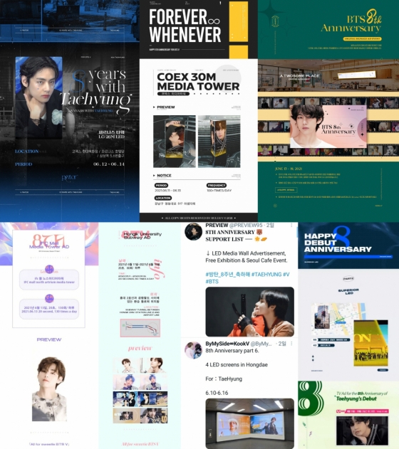 뷔의 팬들은 국내외에서 대규모 광고 서포트와 기부 릴레이로 뜻깊은 데뷔 8주년을 만들고 있다.