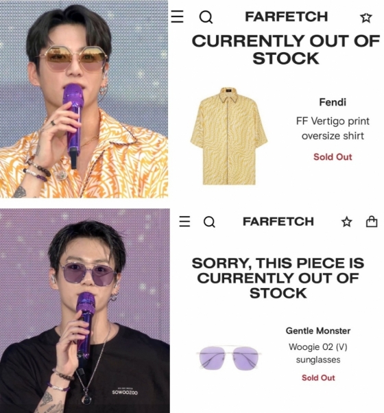 '정국효과'는 계속됐다. 13일 오후 6시 30분(한국시간) 온라인 팬미팅 'BTS 2021 머스터(MUSTER) 소우주' 공연에서 정국이 착용한 노란색 펜디 셔츠와 젠틀 몬스터 선글래스도 파페치(Farfetch) 공식 쇼핑몰에서 품절됐다.