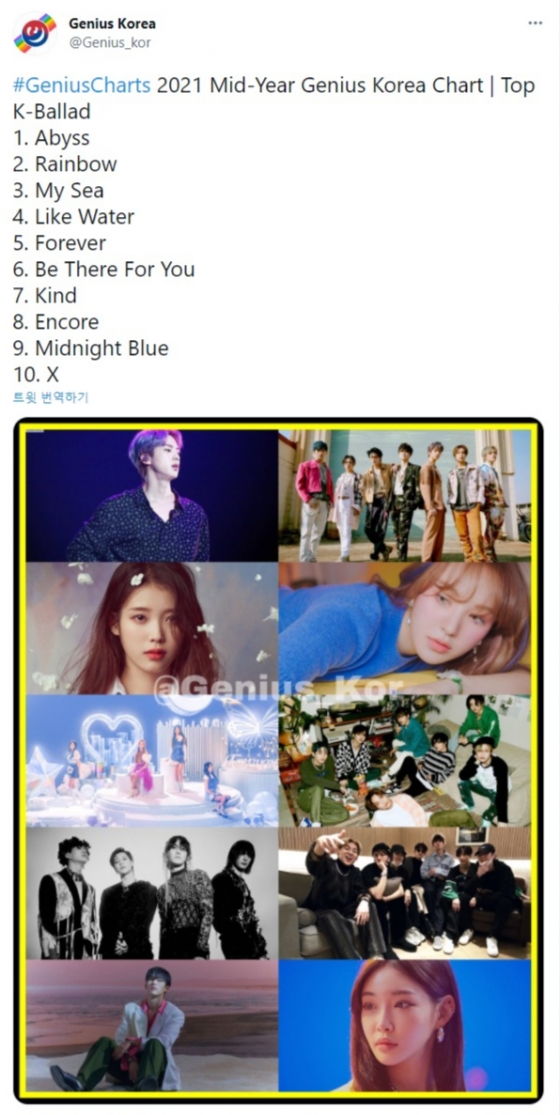 방탄소년단(BTS) 진의 자작곡 '어비스'(Abyss)가 '지니어스 코리아' K팝 발라드 부문 상반기 차트 최고 순위를 기록하며 인기를 입증했다.
