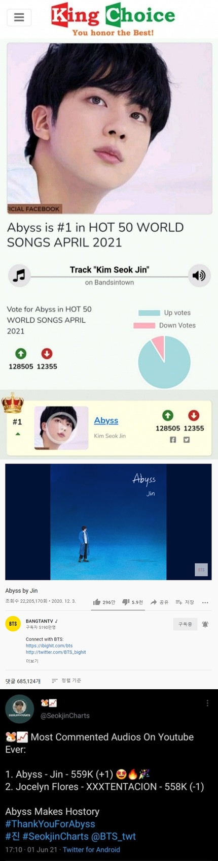 '어비스'는 지난 1일 55만개의 댓글로 기존 유튜브 전 세계 1위였던 'XXXTENTACION(XXX텐타시온)'의 'Jocelyn Flores'를 제치고 최다 댓글 기록을 달성했다. 15일 현재 68만개의 댓글이 이어지고 있다. 또 유명 K팝 투표 웹 사이트인 '킹초이스'에서 2021년 핫 50월드송 부문 5개월 연속 1위를 차지하여 진과 '어비스'에 대한 팬들의 뜨거운 사랑을 보여줬다.