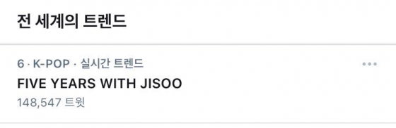 글로벌 팬들은 지수가 블랙핑크 멤버로 공개된 날을 추억하는 'FIVE YEARS WITH JISOO' 태그로 지수 공개 주년을 축하했다. 전 세계 팬들의 축하가 이어지면 'FIVE YEARS WITH JISOO' 는 트위터 월드와이드 실시간 트렌드 6위에 올랐다.