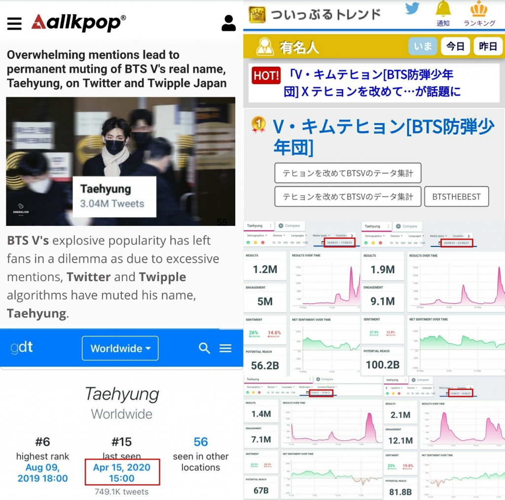뷔의 이름 'TAEHYUNG'은 일본 트위플 뿐만 아니라 알 수 없는 이유로 지난해 4월 이후에 전 세계 각국의 실시간 트렌드에도 반영되지 않고 있다.