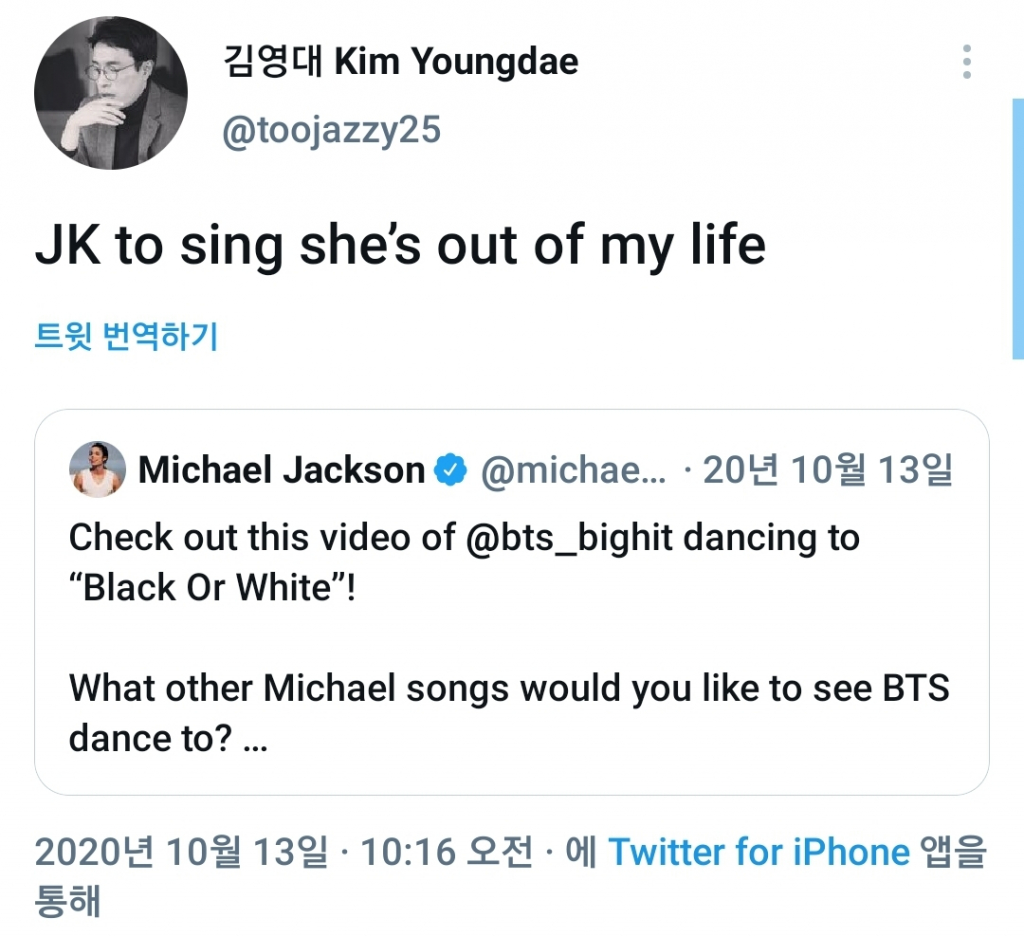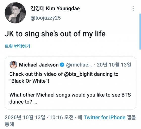 앞서 2018년 김영대는 유튜브 채널을 통해 진행한 음악 토크에서 "정국이 커버한 '그때 헤어지면 돼' 를 듣고 난 후 반사적으로 찾은 노래가 마이클 잭슨의 'she's out of my life' 였다. 마지막에 흐느끼는 느낌에서 정국의 목소리가 연상됐다"라고 했다. 이어 2020년 8월 자신의 SNS에 "JK(정국)가 she's out of my life를 부르길"이라는 글을 게재하는 등 정국과 마이클 잭슨을 함께 여러 차례 언급한 바 있다.