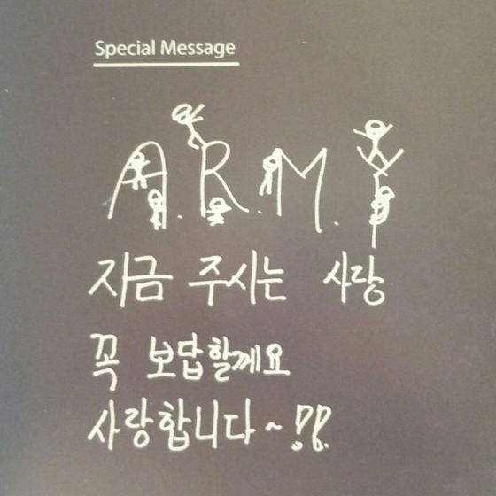 지민은 패랭이를 쓰고 방탄소년단 팬덤의 응원봉 '아미밤'을 연상케하는 동그란 머리에 한국 전통 도복을 입고 봉을 들고 있는 모습을 묘사했다. 지민은 한글로 직접 '홍길동'이라고 썼다.