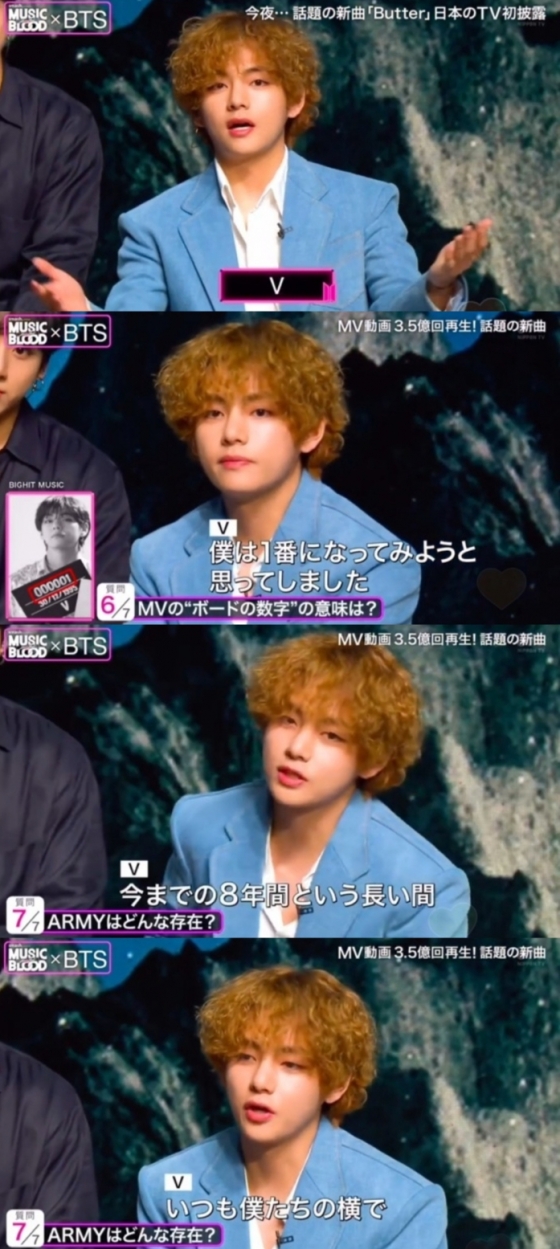 진행자가 뷔에게 팬들의 존재에 대해서 질문을 하자, 뷔는 "지난 8년 동안 항상 우리 곁에서 묵묵하게 바라봐주고 응원해주고 토닥여주고 같이 울고 운 베스트프렌드!"라고 답해 감동을 선사했다.