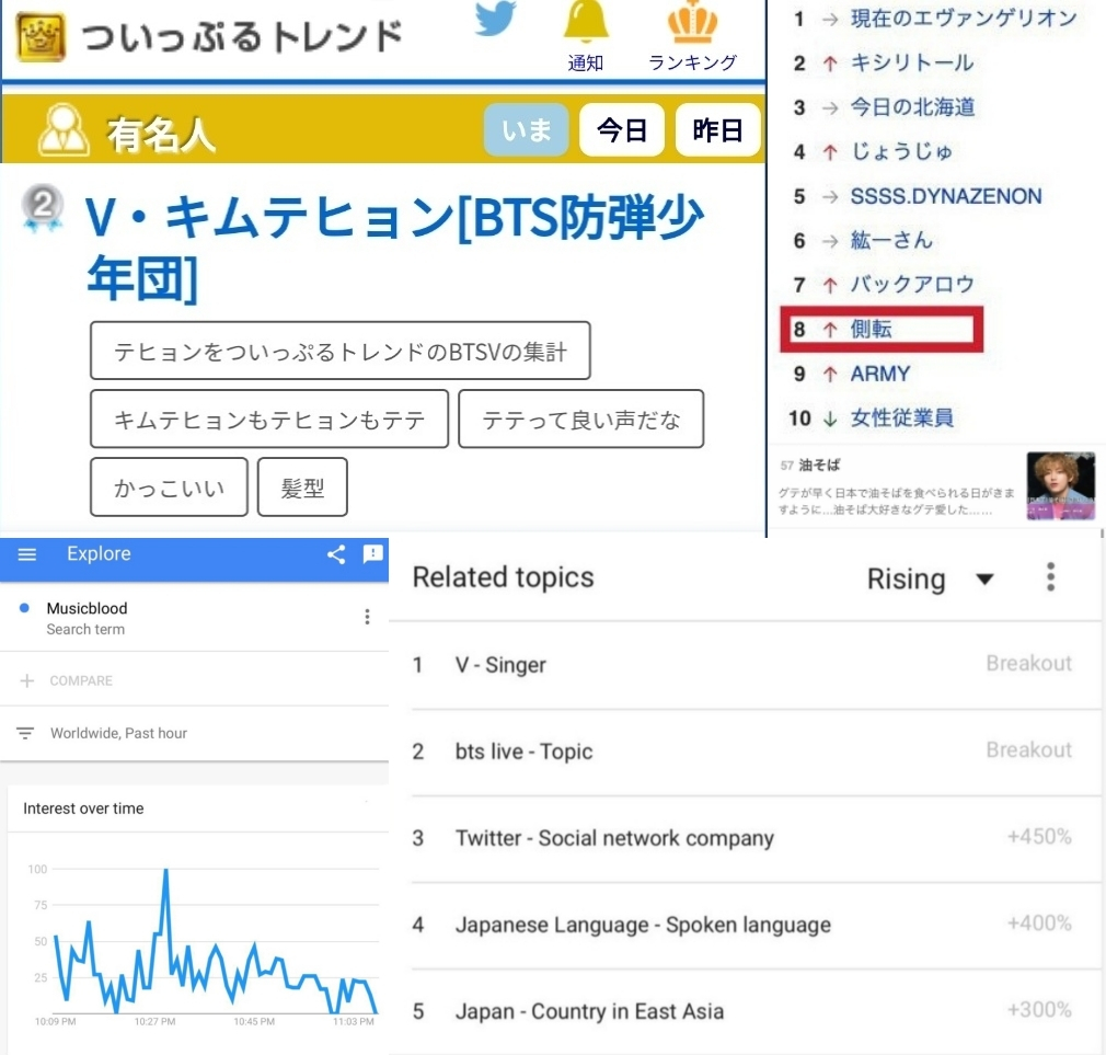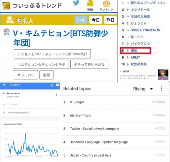 방송 후 뷔는 트위플 유명인 랭킹 2위에 올랐다. 뷔는 'MUSICBLOOD'의 구글 트렌드 관련토픽 1위에 등장, 증가율 급증(Break Out)했으며 '야후재팬'에는 방송에서 옆으로 재주넘기를 했는데 이를 뜻하는 일본어 '측전'(側?)이 실시간검색어 8위, 뷔가 언급한 일본 음식 아부라소바가 57위 등을 기록해 뜨거운 관심을 입증했다.