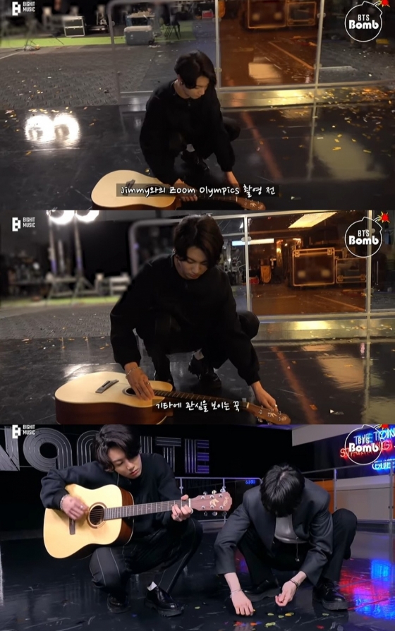 정국은 Jimmy와의 Zoom Olympics 촬영 전 무대 바닥에 놓여 있는 통기타를 발견하며 관심을 드러냈다.