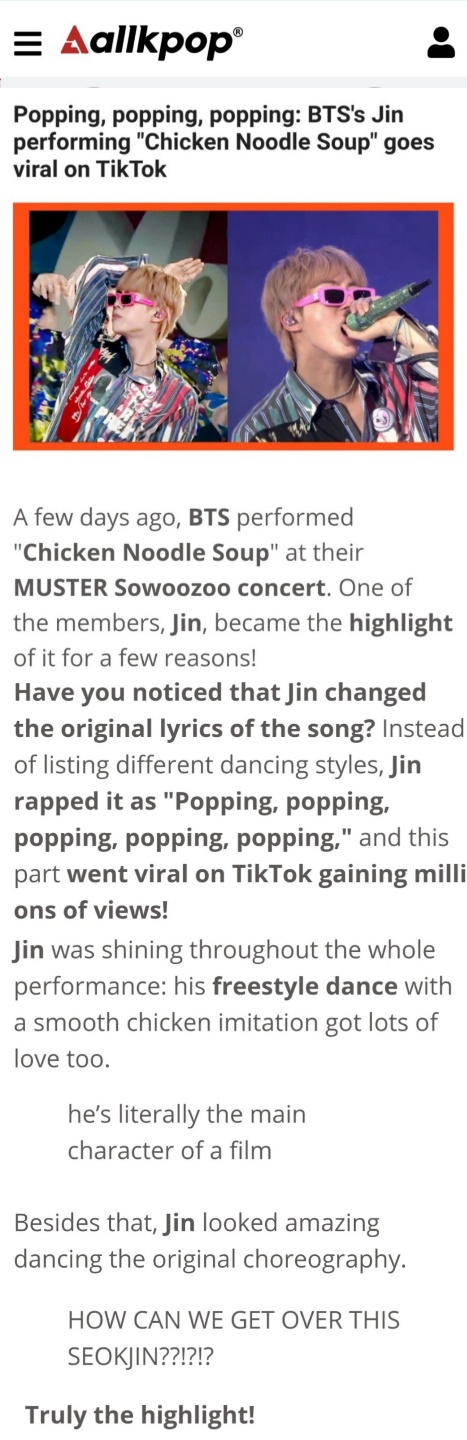미국 연예 매체 올케이팝(Allkpop)은 'Popping, popping, popping: BTS's Jin performing "Chicken Noodle Soup" goes viral on TikTok'이란 제목의 기사를 게재하며 치킨 누들 수프에서 진의 '퍼피퍼피'가 소우주 무대에서의 하이라이트였으며, 현재도 틱톡에서 입소문을 타며 유행되고 있다고 전했다.