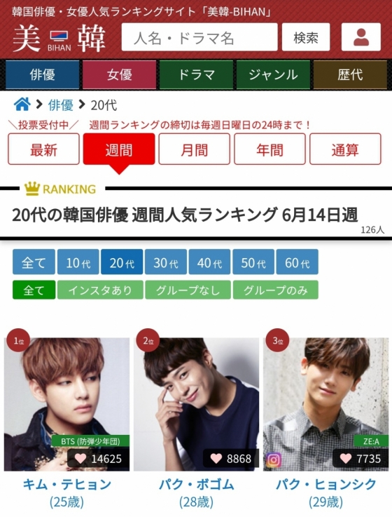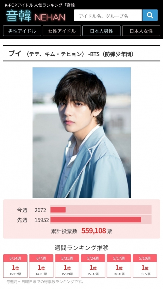 뷔는 6월 14일부터 6월 20일까지 진행된 일본 아이돌 랭킹 사이트 '네한'(音韓)에서 진행된 'KPOP 남성 아이돌 랭킹 투표'에서 총 1만 5952표를 획득하며 1위를 차지했다. 뷔는 적수 없는 인기를 보이며 12주 연속 1위에 오르는 신기록 행진을 이어가고 있다.