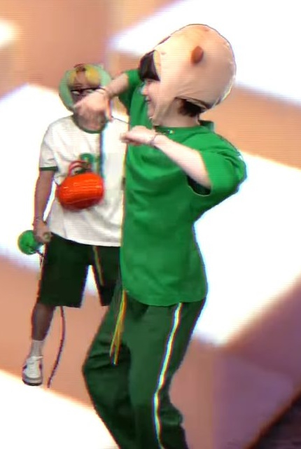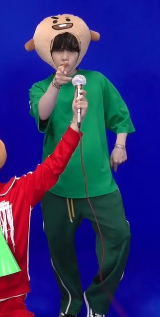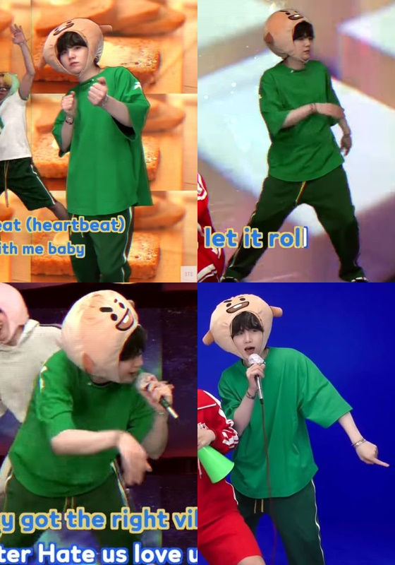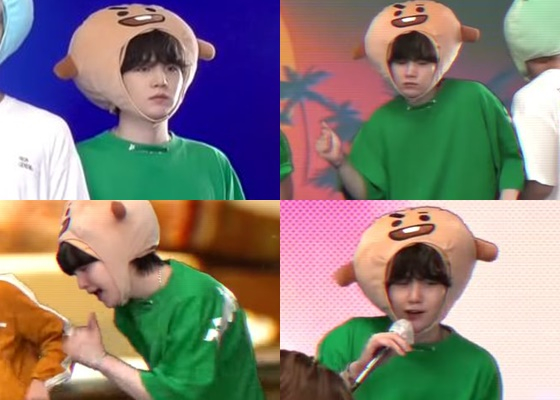 슈가는 인형탈을 뒤집어 쓰고 녹색 상하의 트레이닝복 차림으로 등장해 눈길을 끌었다.