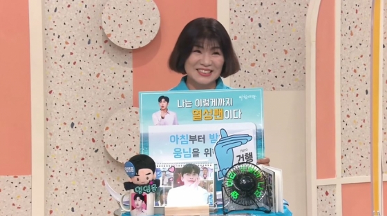 송 씨는 화면에서부터 임영웅의 '찐 팬'임을 엿보게 했다. '아침마당' 스튜디오 송 씨 앞 테이블 위에 임영웅 굿즈로 빼곡히 차있었던 것.