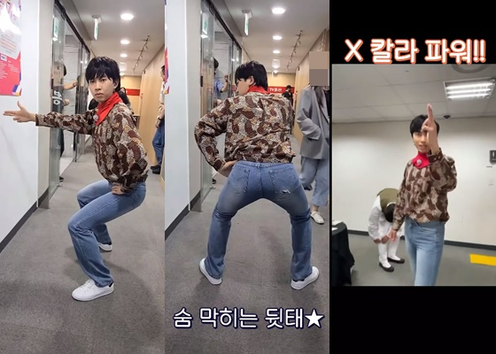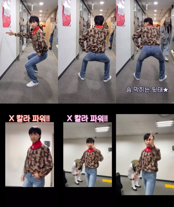 임영웅은 엉덩이를 쭉 빼고 '복학생'의 자세를 연습했고, "선생님 X칼라파워!"라며 '복학생' 유행어도 쉼 없이 따라 했다.