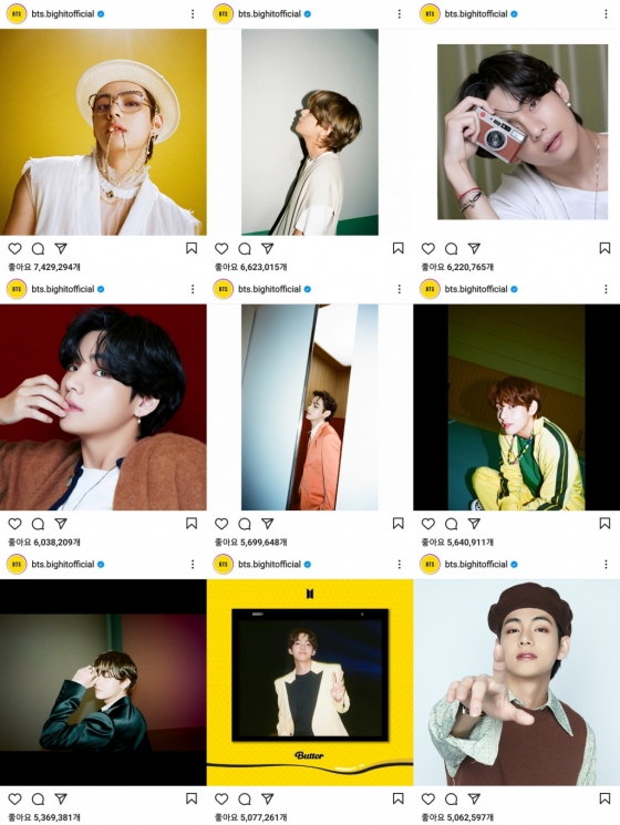 뷔는 방탄소년단 공식 인스타그램에 게재된 개인 포토 중 '좋아요' 700만 이상을 받은 포토 한 장, 600만 '좋아요'는 세 장, 다섯 장의 사진이 '좋아요' 500만 이상을 기록했다.