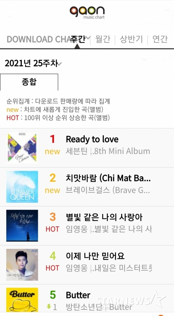 1위는 세븐틴의 'Ready to love', 2위는 브레이브걸스의 '치맛바람', 5위는 방탄소년단 'Butter'였다. 1, 2위는 최근 나온 신곡이고, 'Butter'는 빌보드 차트 핫 100 1위에 올라있는 글로벌 톱 인기곡이다.