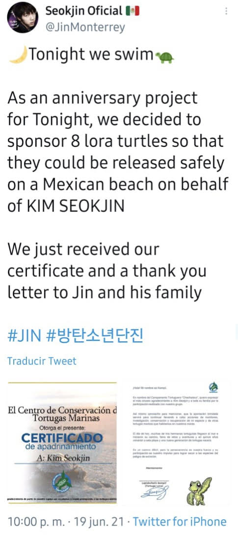 진의 멕시코 팬베이스는 바다 거북 보호 및 연구 센터 Campamento Tortuguero Chachalaco에 진의 이름으로 후원, 거북이 8마리를 멕시코 해안에서 안전하게 바다로 돌려보냈다.