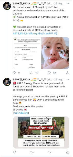 진의 인도 팬베이스는 '이 밤' 2주년을 맞아 인도 동물 재활 보호 기금(ARPF)에 2300루피를 기부했다.