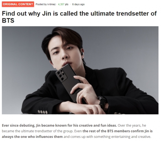방탄소년단(BTS) 진은 독창적이고 창의적인 센스와 관련 해외매체가 이를 집중 조명했다.