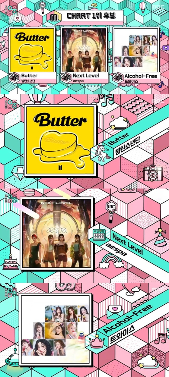 26일 방송된 MBC '쇼! 음악중심'에서는 방탄소년단의 'Butter', 에스파의 'Next Level', 트와이스의 'Alcohol-Free'가 1위 후보에 올랐다.