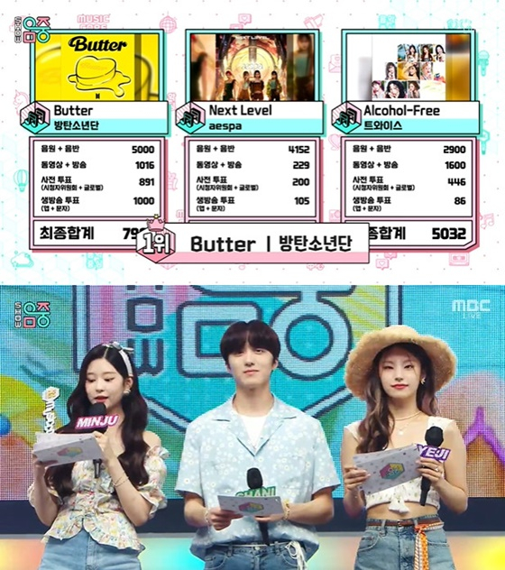 26일 방송된 MBC '쇼! 음악중심'에서는 방탄소년단의 'Butter'가 에스파의 'Next Level', 트와이스의 'Alcohol-Free'를 꺾고 1위에 올랐다. 이로써 방탄소년단은 '쇼! 음악중심'에서 5주 연속 1위를 차지하게 됐다.