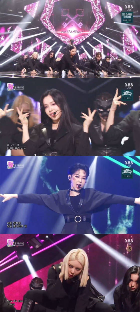핑크판타지(대왕, 시아, 예찬, 하린, 아랑, 희선)는 지난 27일 오후 방송된 SBS '인기가요'에 출연해 신곡 '독' 무대를 펼쳤다. 이날 핑크판타지는 올 블랙 패션으로 다크하면서도 시크한 분위기를 뿜어냈다.
