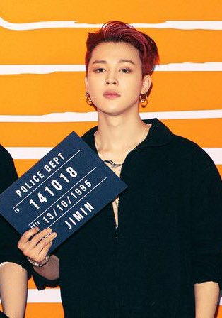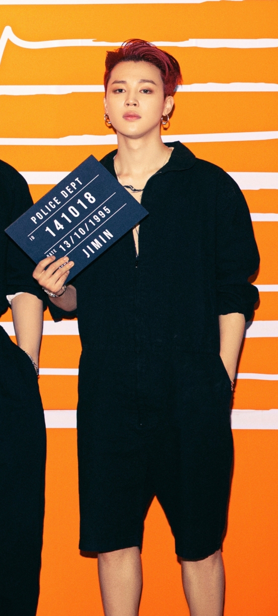 점프 수트 주머니에 찔러 넣은 지민의 한 손에 하트 모양의 수갑이 걸려 있고 다른 한 손에는 이름과 생년월일을 그리고 의미있는 번호가 적인 판을 들고 있다.