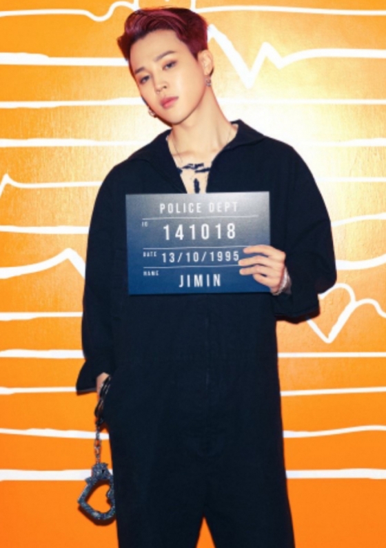 이번에 공개된 콘셉트 포토는 '버터' 뮤직 비디오에서 등장했던 머그샷 버전으로, 지민은 강렬한 숏컷의 레드 헤어와 검정색의 반바지 점프수트를 입고 등장해 시선을 사로 잡았다.