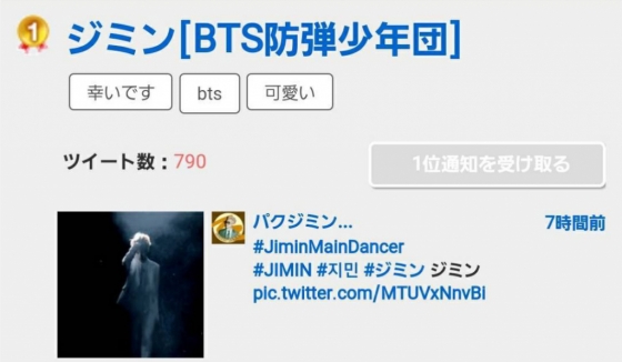 뿐만 아니라 방탄소년단의 메인댄서인 지민의 해시태그 #JiminMainDancer 가 일본 유명인 트위플 1위에 올랐으며, #JiminKoreaItboy 가 한국 실시간 트렌드 5위를 차지하는 화제성을 일으켰다.