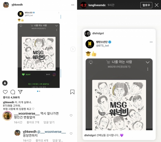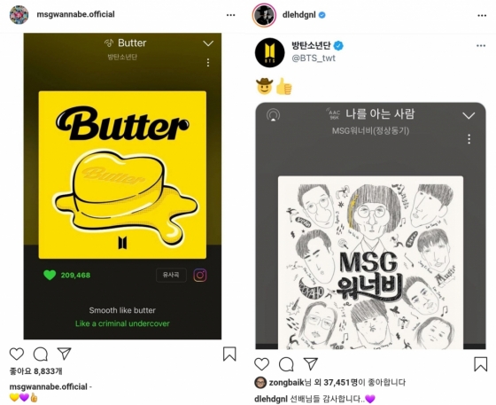 이어 'MSG워너비'는 공식 인스타그램에 방탄소년단의 'Butter'(버터)를 스트리밍하는 인증 사진을 올리며 화답했다. 또 멤버인 배우 이동휘가 자신의 인스타그램에 "선배님들 감사합니다"라며 방탄소년단을 상징하는 보라색 하트를 함께 게재해 훈훈함을 자아냈다.