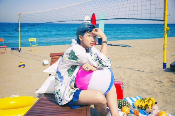 공개된 사진에서 RM은 커다란 비치볼을 안은 채 측면으로 지그시 바라보고 있다. 자유로운 해변에서도 RM만의 스마트함은 빠지지 않았다. 파란 반바지 아래 RM이 미끈한 다리로 눈길을 모았다.