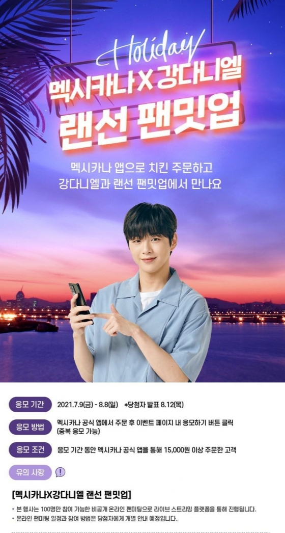 강다니엘이 모델로 활약하고 있는 멕시카나치킨은 1일 오후 홈페이지를 통해 '멕시카나 X 강다니엘 랜선 팬밋업'을 공지했다.