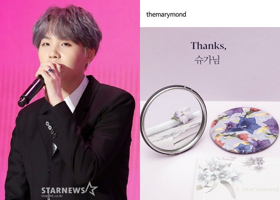 마리몬드는 글과 함께 슈가가 그간 착용했던 자사 제품 중 평화를 향한 정의로운 걸음을 의미하는 '용담'도 소개했다. 슈가가 사용했던 포켓미러 용담은 현재 판매하지 않는다고도 전했다.