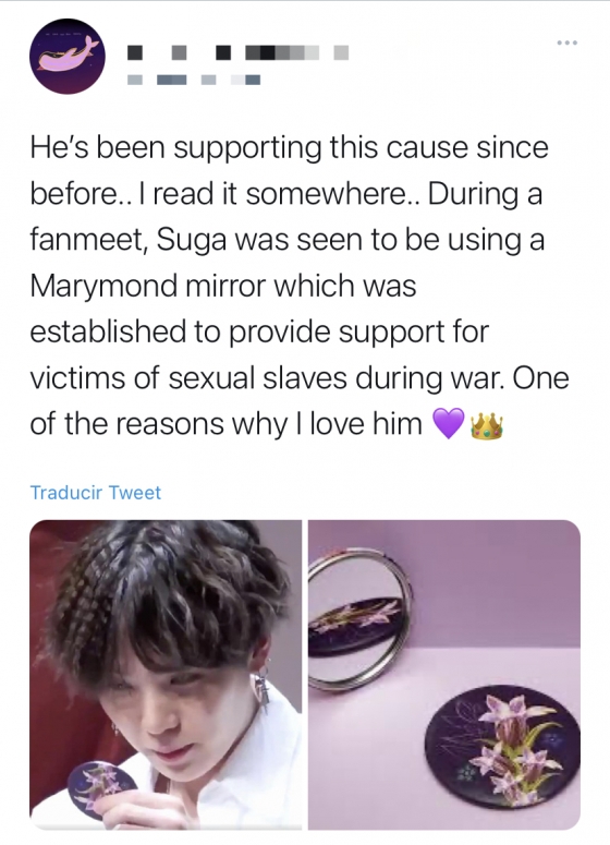 액세서리 업체 마리몬드(Marymond)는 최근 공식 인스타그램을 통해 "팬 사인회나 앨범 발매 쇼케이스 등 행사 때마다 특별한 액세서리를 착용해 메시지를 전하고 있는 아티스트 '민윤기님'덕분에 오늘도 일본군'위안부' 문제를 비롯한 여성과 아동 폭력 문제 해결에 한 걸음 다가갈 수 있었습니다"라고 밝혔다.