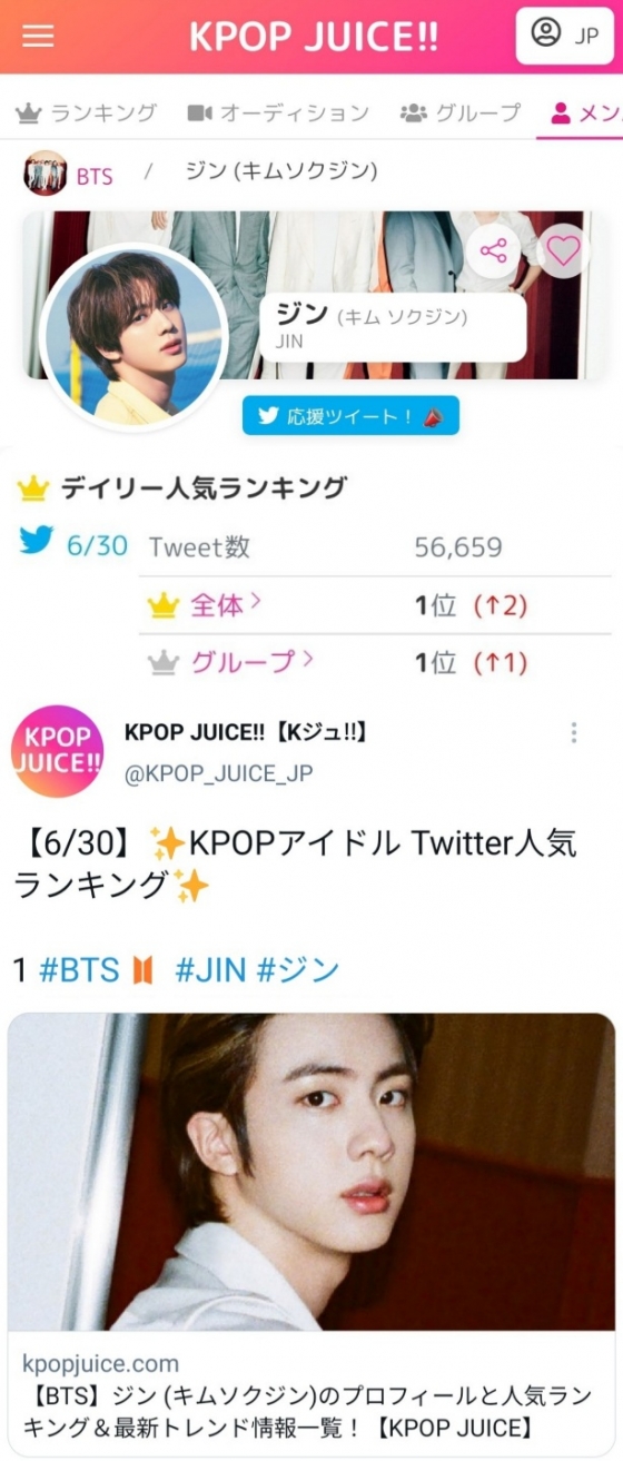 방탄소년단(BTS) 진이 지난 30일 일본 '케이팝 주스(KPOP JUICE)' 아이돌 인기랭킹에서 데일리 투표 랭킹 1위에 오르며 일본에서의 높은 인기를 입증했다.