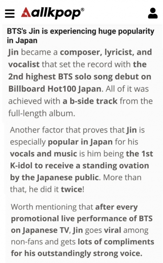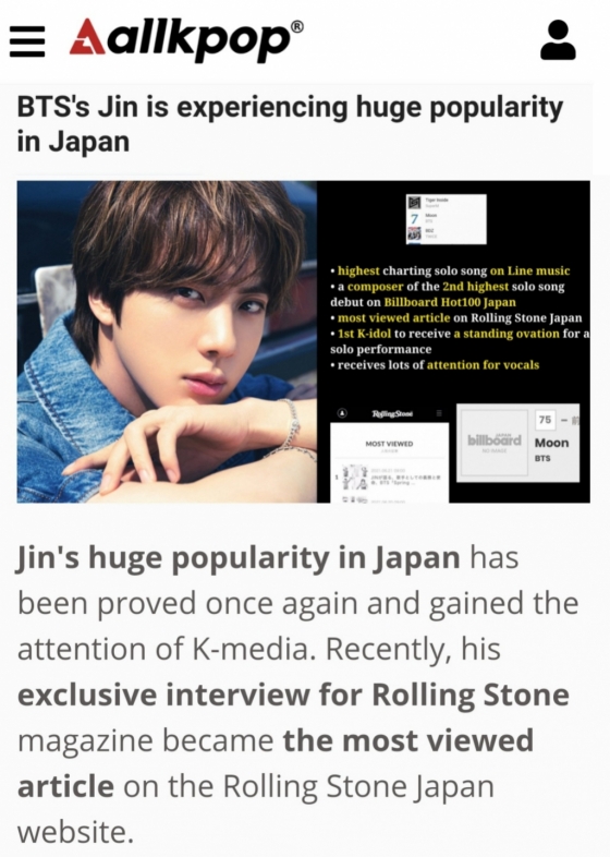 미국 연예 매체 'allkpop'(올케이팝)도 일본에서 진의 큰 인기를 전하며 주목했다. 매체는 "BTS's Jin is experiencing huge popularity in Japan(방탄소년단 진은 일본에서 큰 인기를 누리고 있다)"는 제목의 기사를 게재하며 진의 엄청난 인기를 전했다.