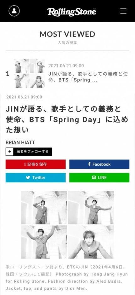 최근 진의 미국 음악 전문 매거진 Rolling Stone 잡지와의 독점 인터뷰는 Rolling Stone Japan 웹 사이트에서 가장 많이 조회 된 기사가 됐다.