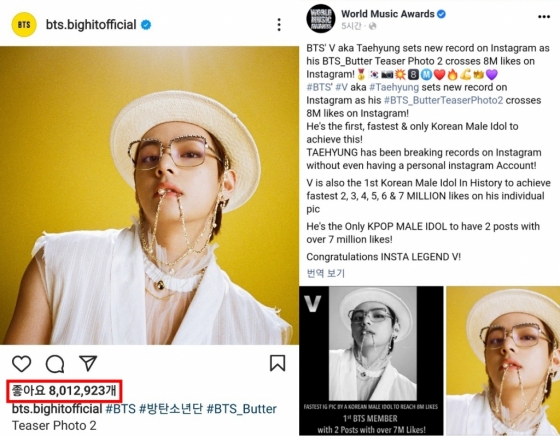 뷔의 두 번째 '버터' 콘셉트 티저포토는 지난 2일 한국 남자연예인 최초로 800만 '좋아요'를 돌파했다. 뷔는 이로써 인스타그램 포토로 700만 '좋아요' 2개를 기록, 방탄소년단 공식 인스타그램 '좋아요' 1, 2위도 석권했다.