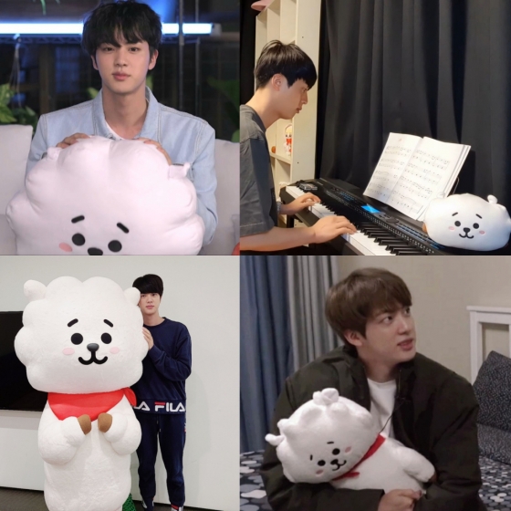 하얀 솜뭉치 같은 귀여운 외모로 많은 사랑을 받고 있는 알제이는 진이 만든 라인프렌즈 BT21 캐릭터로, 평소에도 진은 알제이 굿즈를 자주 애용하며 알제이를 '아들'이라고 표현할 정도로 특별한 애정을 보여왔다.