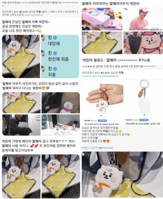 팬들은 "석진이 알제이 애지중지 달고 다니는 거 상상돼서 귀여워서 눈물나ㅠ", "사고 싶어서 달려갔지만 품절ㅠㅠ", "귀여운 알제이 달고 다니는 귀여운 석진이", "석진이 너무 사랑스러워. 알제이 꼬박꼬박 데리고 다녀ㅠ", "본투비 왕귀염둥이 진짜 귀여워", "석진이 아들 사랑 찐이야 귀여워", "글 보자마자 알제이 키링 당장 샀어", "지금 키링 사려고 했는데 품절됐음ㅠ 라인 프렌즈 빨리 재입고 해주세요ㅠㅠ"등 뜨거운 반응을 나타냈다.