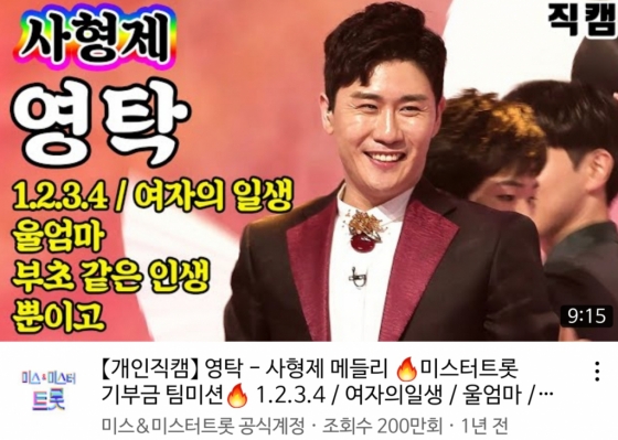지난해 2월 15일 미스&미스터트롯 공식 유튜브 채널에 공개된 '영탁 - 사형제 메들리 미스터트롯 기부금 팀미션 1.2.3.4 / 여자의일생 / 울엄마 / 부초같은인생 / 뿐이고)' 개인직캠 영상은 4일 오전 200만 뷰를 넘어섰다.